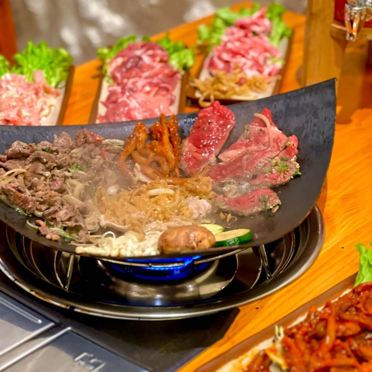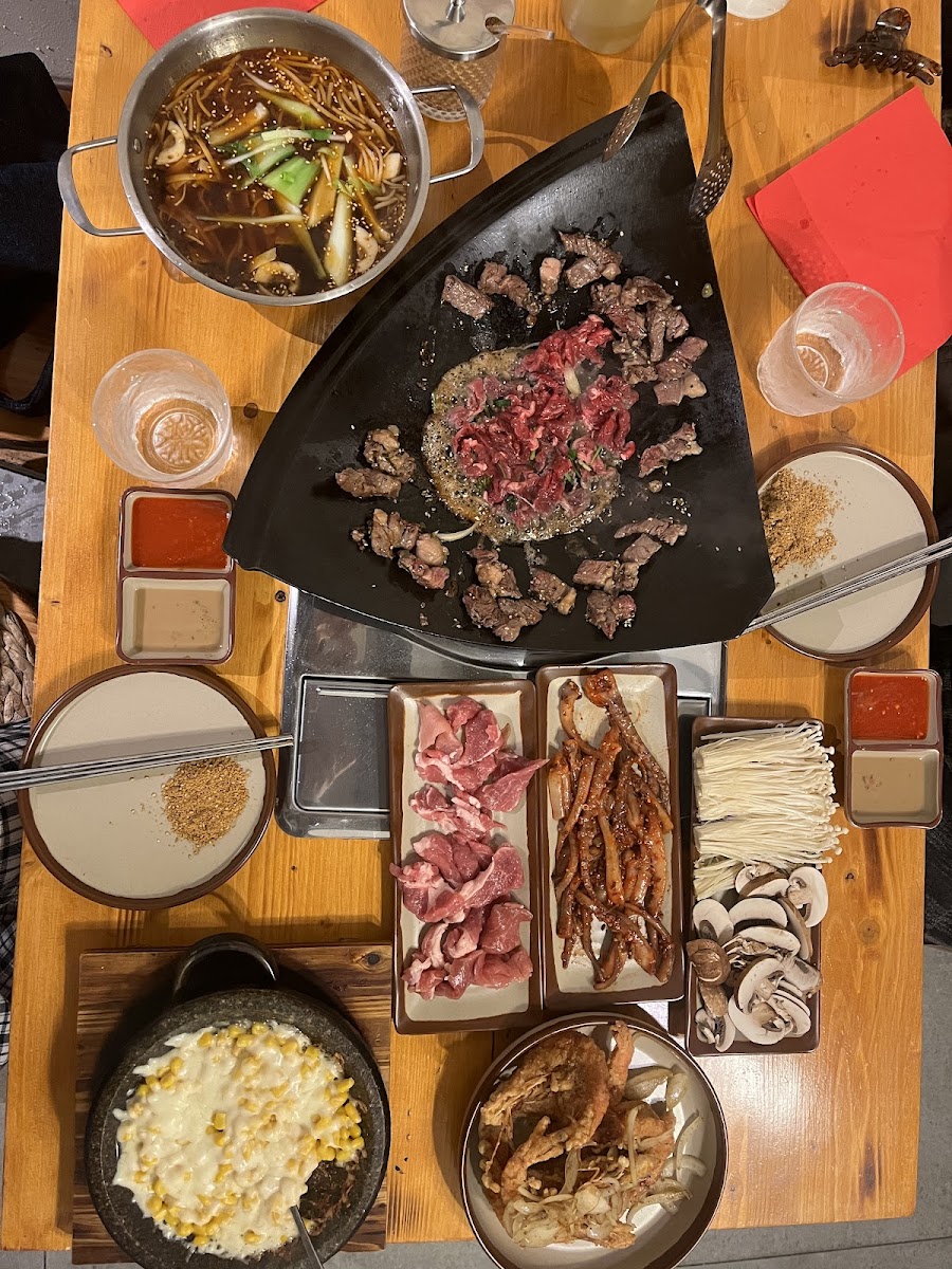 love the bbq buffet, the shape of the pan is very unique, and the food is very fresh and well seasoned, 32.8 euro pp is a very good deal, and you can order 4 rounds, recommend the beef, chicken, different organs if you're a fan, mushroom, cheese corn, peach as dessert, honey yuzu tea as drink to share. I like the vibe of this restaurant, and the service is really good as well.